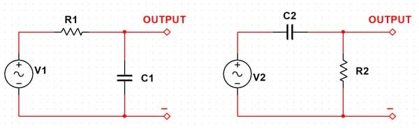 Figure 2: RC filters: Low pass filter on the left; high pass filter on the right.