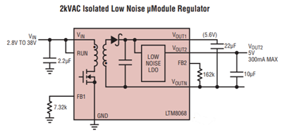 Linear Technology/Analog Devices LTM8067 und LTM8068 µModule®-DC/DC-Wandler sind isolierte Sperrwandler-Leistungsmodule mit 2 kV AC. Im Gehäuse sind ein Schaltregler, Leistungsschalter, ein Transformer, ein LDO und alle Peripheriebauteile enthalten. Diese Wandler werden über einen Eingangsspannungsbereich von 2,8 bis 40 V betrieben und unterstützen einen Ausgangsspannungsbereich von 2,5 bis 18 V, der durch einen einzelnen externen Widerstand eingestellt wird.Merkmale