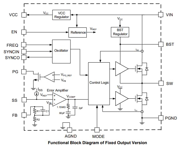 - Selectable Advanced Asynchronous Mode (AAM) or Forced Continuous Conduction Mode (FCCM)