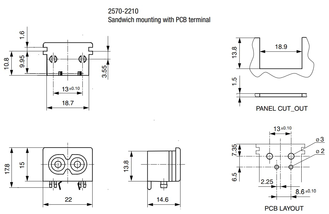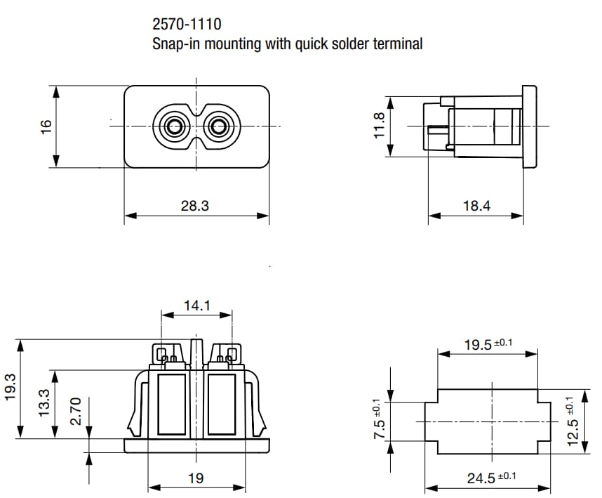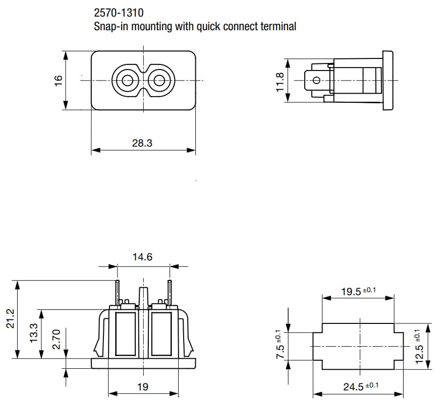 Schurter 2570 IEC Appliance Terminals are designed to allow connections to the equipment circuitry using a separate detachable AC line cord. These Schurter terminals have a high-quality Polyamide 6 (PA6) housing which has a flammability rating of UL 94V-0. The 2570 terminals have an operating temperature range of -25°C to +70°C, a panel thickness of 0.6mm to 2mm for snap-in, and 1.5mm for split-panel. These terminals are available in inlet C8 solder, quick connect, and PCB variants and are suitable for appliances with protection class II.Features
